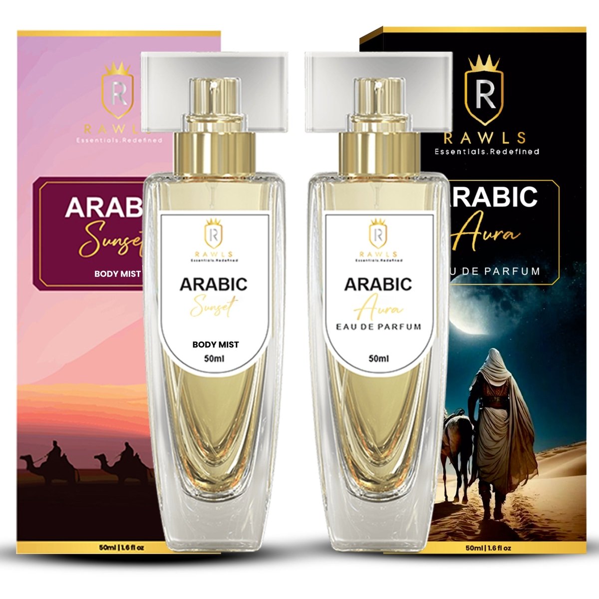 Experience the intoxicating scents of the Middle East with our Arabic Aura Perfume & Arabic Sunset Mist - Valentine Perfume Combo For Him & Her. Indulge in the luxurious fragrances of Arabic Aura, a blend of spices and rich floral notes, and Arabic Sunset, a refreshing mist infused with warm amber and sandalwood. Perfect for a romantic evening.