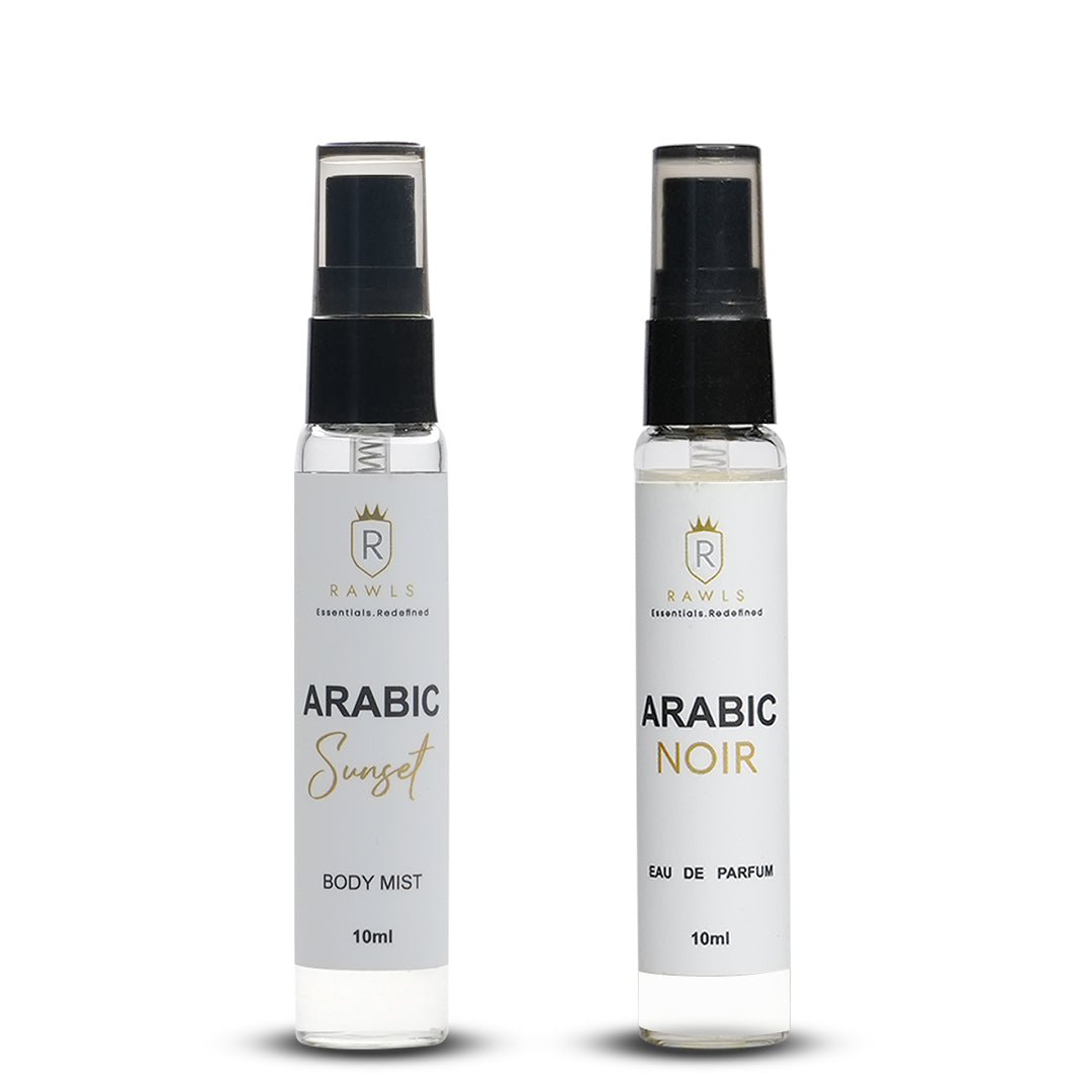 Experience the best of both worlds with our Dusk & Dark Duo. Featuring our vibrant Arabic Sunset Mist in a 10ml bottle and our intense Arabic Noir in a 10ml bottle, this set offers the perfect combination for a sensory journey. Enjoy the benefits of our alluring scents, handcrafted to perfection.