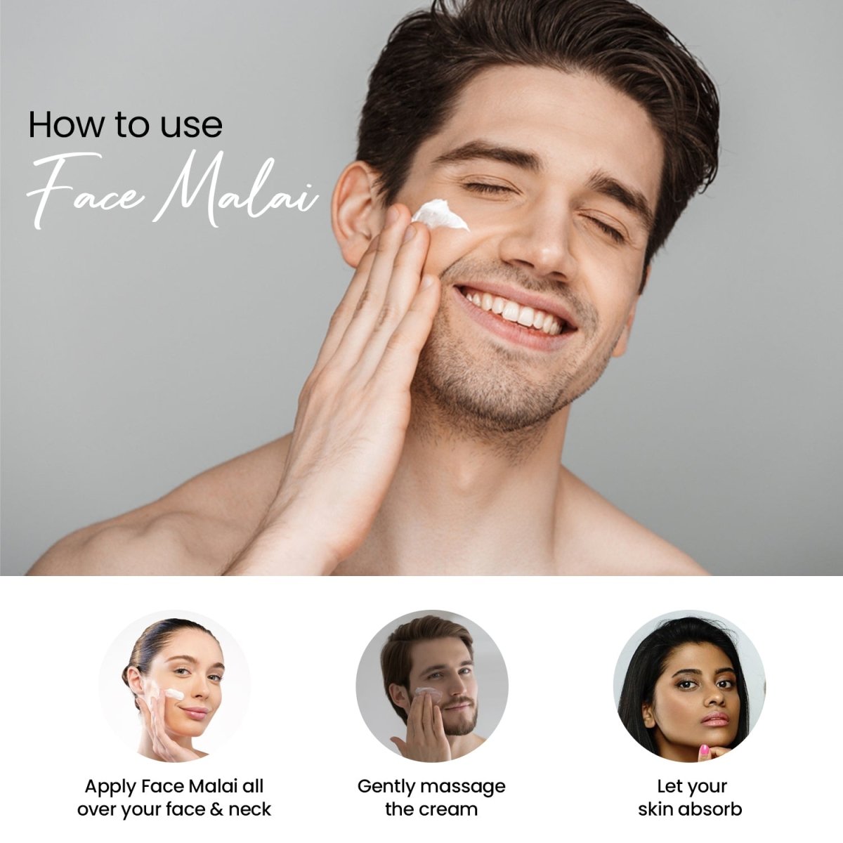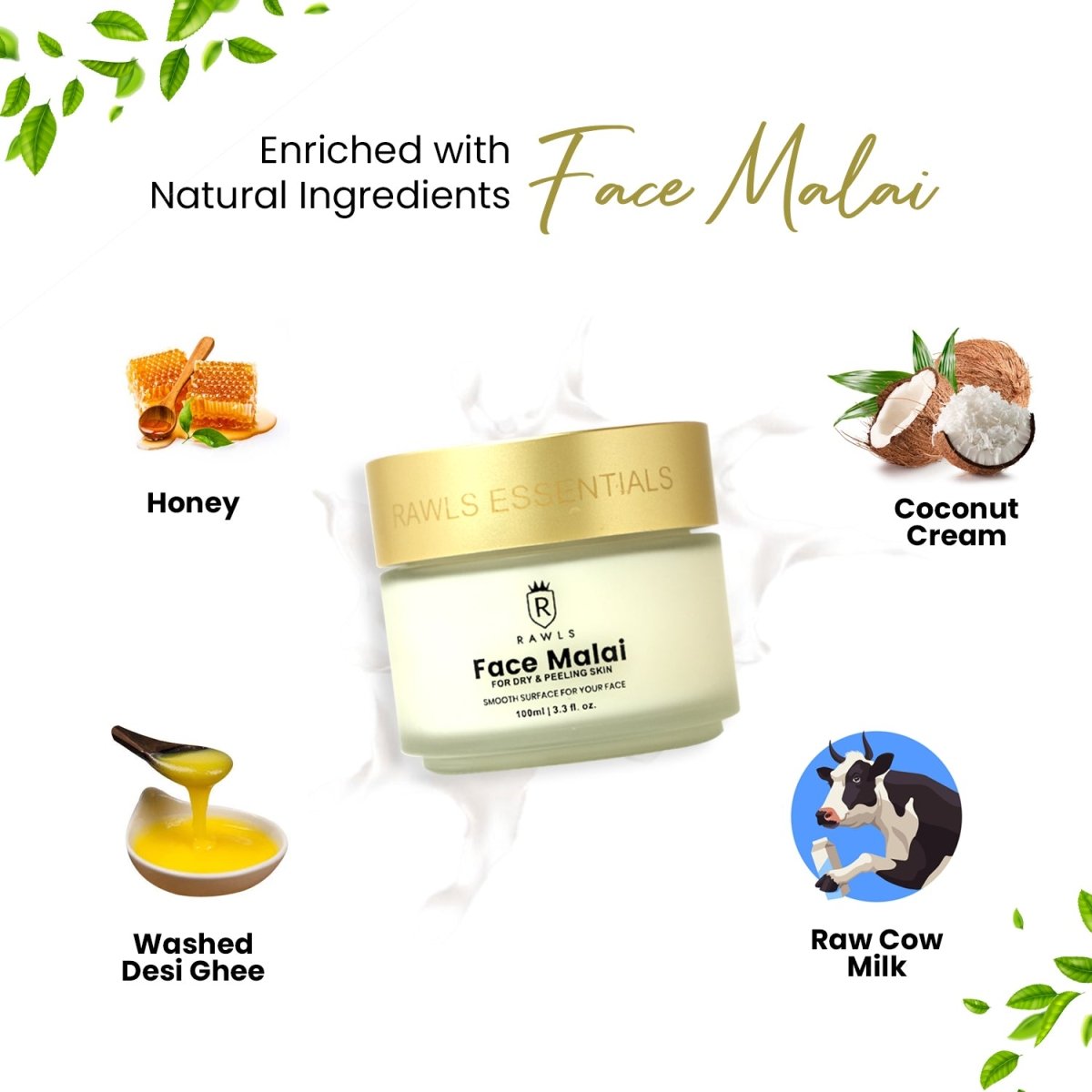 RAWLS Face Malai is a luxurious facial cream that provides nourishment and healing for your skin. With a rich coconut cream base, it offers a smooth and easy application experience. The cream is designed to protect, nourish, and hydrate your skin, leaving it looking radiant and healthy. RAWLS Face Malai is crafted with care using fresh ingredients and natural honey, ensuring a high-quality product. Pamper your skin with this luxurious facial cream and experience the benefits of its nourishing properties for a healthy, glowing complexion.